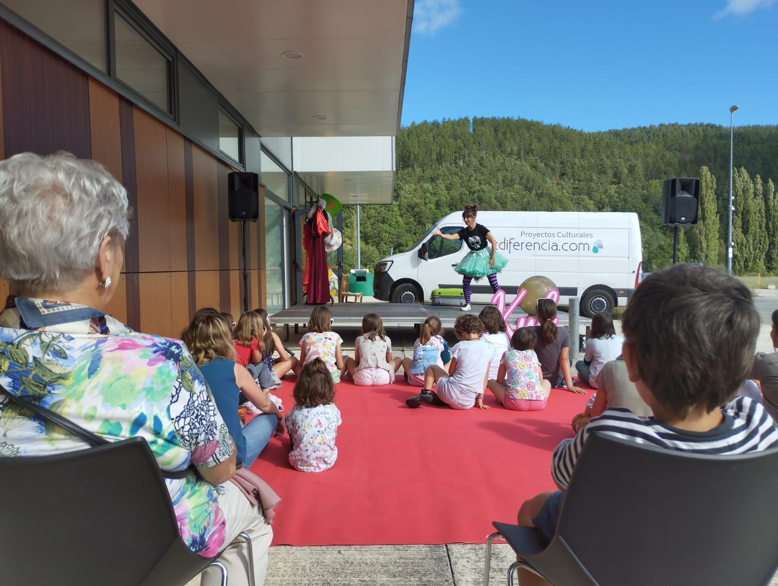 KUL viajó el sábado hasta Burgi y en su polígono industrial instaló el escenario de los Sábados veraniegos. El Centro Polivalente se convirtió en improvisado museo para acoger las pinturas y las fotografías y, de nuevo, el público disfrutó con el teatro.